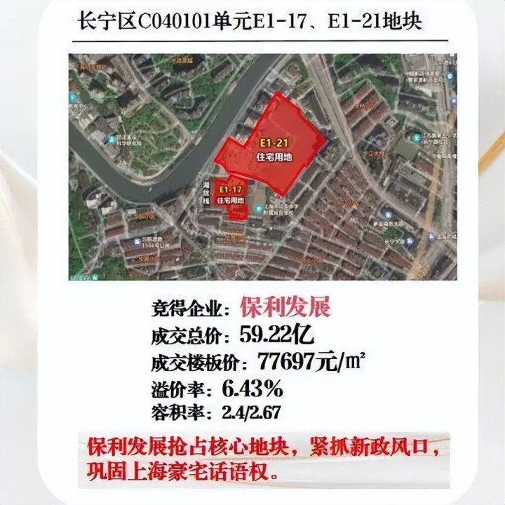 上海2026年度第二批次集中土拍落幕,仅有长宁区一幅宅地出让,最终保利发展59.2175亿成功拿下长宁区C040101单元E1-17、E1-21地块,溢价率6.4%,成交楼板价7.77万每平。