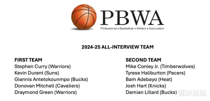 第一届PBWA最佳采访阵容名单,也就是2024-25赛季的最佳采访阵容名单是:一阵:库里、杜兰特、字母哥、米切尔和追梦二阵:康利、哈利伯顿、阿德巴约、哈特和利拉德