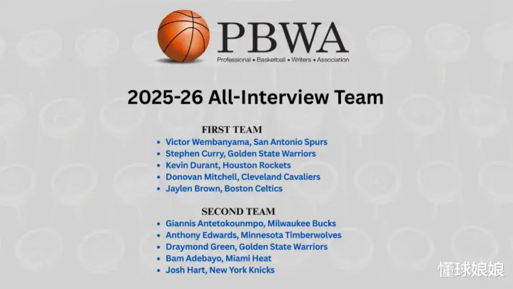 职业篮球记者协会(PBWA)近日公布了2025-26赛季的最佳采访阵容名单。
