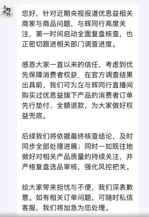 “感恩大家一直以来的信任,考虑到优先保障消费者权益,在官方调查结果出具前,我们可为在与辉同行直播间购买过优思益旗下产品的消费者订单先行垫付、全额退款,为大家做好权益兜底。”与辉同行称。(中国经济网)