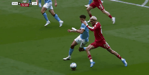 第39分钟,范戴克禁区内放倒奥赖利,主裁判罚点球。哈兰德主罚命中,曼城1比0领先。